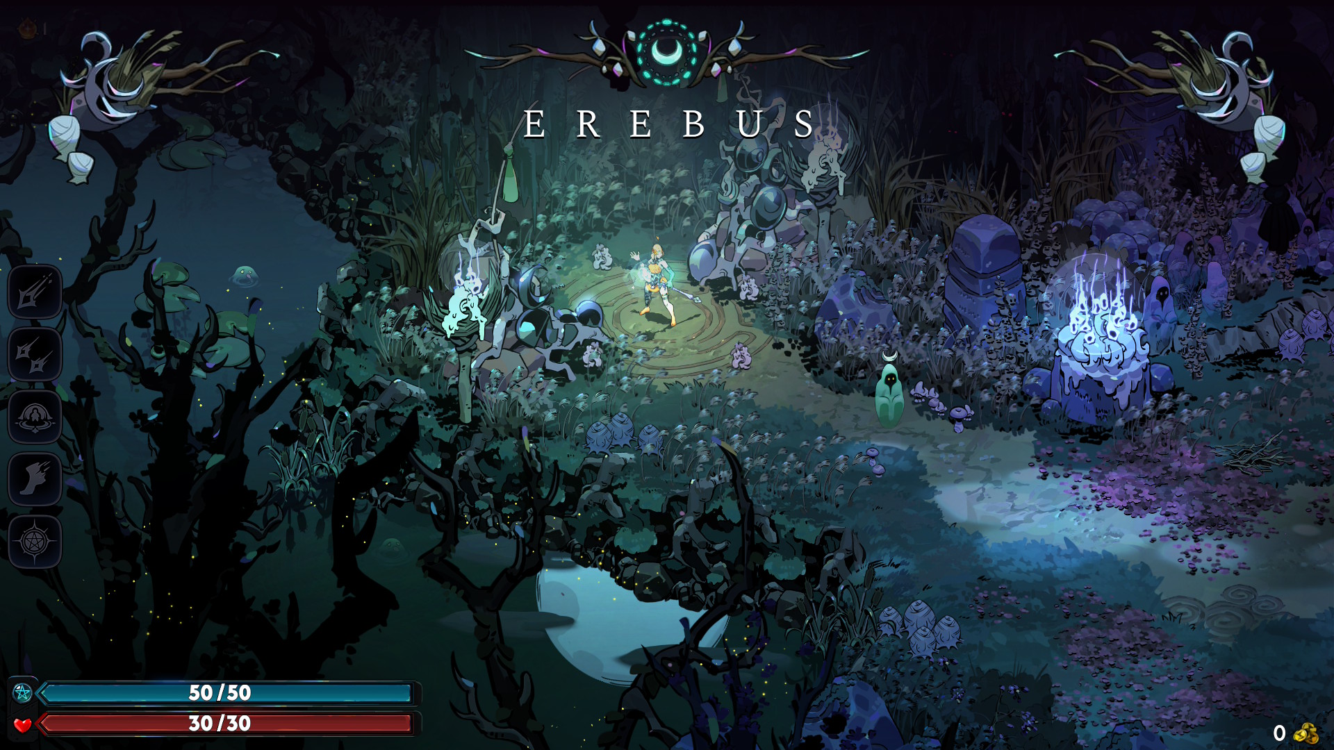 Melinoë on kasvanut noitien opissa, mikä heijastuu myös taisteluihin. Hyökkäysnappia pohjassa pitämällä on mahdollista kuluttaa manaa, jolloin hyökkäys voimistuu tai sen kesto pitenee. Tämä on tärkeä taito etenkin silloin, kun taktiikkana on vihollisten räiskiminen kauempaa. Loputtomiin ladattuja iskuja ei voi kuitenkaan käyttää, ellei taikapisteiden automaattiseen palautumiseen investoi muutamaa päivitystä. Aseluokkia on kuusi erilaista, eikä yksikään niistä ei ole suora kopio Zagreuksen varusteista, mutta esimerkiksi kirveellä on avattava päivityspolku, joka viittaa yhteen vain ykkösosassa esiintyvään hahmoon. Asepäivitykset hoidetaan niin onnistuneilta kuin epäonnistuneilta läpipeluuyrityksiltä mukaan kertyneillä materiaaleilla omassa tukikohdassa, ja ne jäävät voimaan pysyvästi.