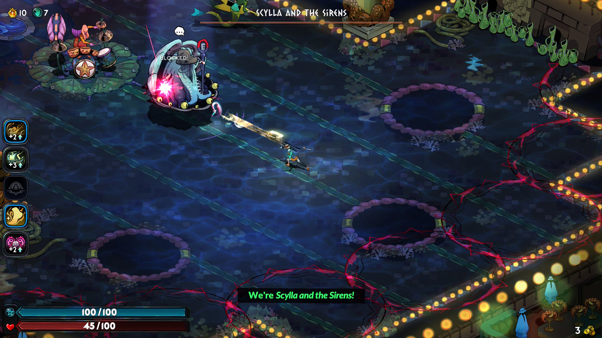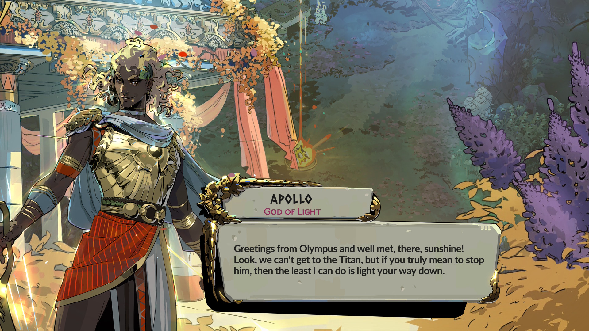 Järeimpiä menestymisen tiellä olevia muureja ovat itseoikeutetusti alueiden loppupomot, jotka osaavat kommentoida noitakyläläisten tavoin muun muassa pelaajan varusteita, ja persoonasta riippuen tyypillisesti joko ilkkuvat tai kehuvat edellistä suoritusta. Kohtaamiset tuntuvat yksilöllisiltä, sillä keskustelut ovat napakoita ja ääninäyteltyjä, hahmoilla on uutta sanottavaa melkein jokaisella tapaamisella ja ilmeikkäät kuvapotretit saavat paljon tilaa ruudulla. Vinkitkin jaetaan pääosin suullisesti tylsien tekstilaatikoiden sijaan, mutta kaikki pelaajat eivät siis näe täysin samaa sisältöä ennen Chronoksen lopullista kaatumista. Supergiantin työntekijät ovat puhuneet haastatteluissa avoimesti epälineaarisen kerronnan yksityiskohtien mestaroimisesta, joten voin vain ihmetellä, miksei yksikään toinen samankaltaisia roguelike-pelejä vääntävä studio ole onnistunut siinä samalla tavalla.
