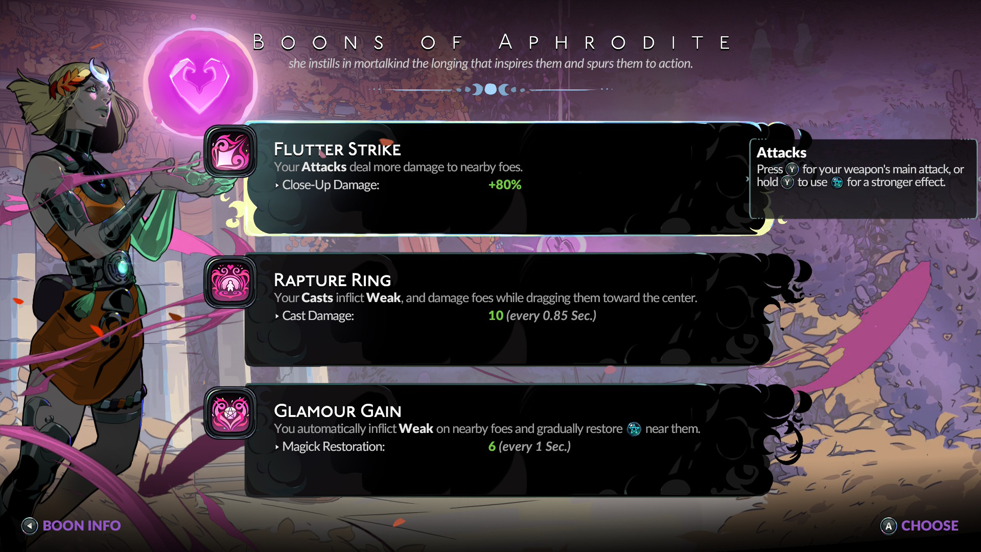 Pelaaja voi halutessaan keskittyä vaikkapa vain yhden tai kahden jumalan kykyihin. Esimerkiksi pelkästään Zeuksen ukkosvoimien haaliminen voi olla hyvä idea vahingon aiheuttamisen kannalta, mutta Poseidonin aallot työntävät vastustajia kauemmas, mistä on apua erityisesti ahtaissa paikoissa. Yhteensopivien jumalaparien etuna kiertoon tulee myös harvinaisia yhdistelmä- ja infuusiokykyjä. Toisinaan päätöksentekoa mutkistaa kykylaatikon vieressä näkyvä kääröikoni, joka osoittaa valinnan vievän myös jotain tukikohdassa tapahtuvaa sivujuonta eteenpäin. Näin ollen pelaajalla on syitä valita välillä heikompi ykköstason päivitys legendaarisen voiman sijaan.
