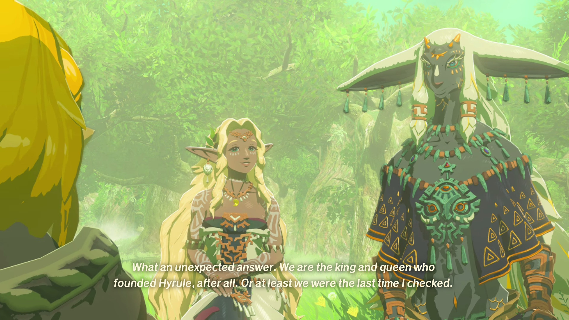 Zelda ja Link kohtaavat The Legend of Zelda: Tears of the Kingdomin alussa muumioituneen ja ajan kahleista vapautuneen Ganondorfin. Kohtaamisen seurauksena Zelda putoaa pimeyteen ja katoaa valopallon saattamana. Herättyään prinsessa löytää itsensä tuhannen vuoden takaa menneisyydestä ja päätyy esi-isänsä sekä Hyrulen kuningaskunnan perustajien, Raurun ja Sonian, suojelukseen. Aikamatkustava prinsessa luonnollisesti varoittaa pariskuntaa välittömästi Ganondorfin uhasta, josta ei ole menneisyydessä tullut vielä pahamaineista demonikuningasta, mutta aikajanaa suojellakseen Rauru “viisaasti” kieltäytyy kuuntelemasta spoilereita. Asiat etenevät odotusten mukaisesti, ja pian Ganondorf aloittaakin marssinsa hirviöarmeijansa kanssa läpi Hyrulen vapaiden kansojen asuttamien maiden ja mantujen. Linkittömässä menneisyydessä prinsessa löytää lopulta itsensä osana legendojen mukaista vangitsemissotaa (Imprisoning War). Paluu takaisin tulevaisuuteen saa odottaa.
