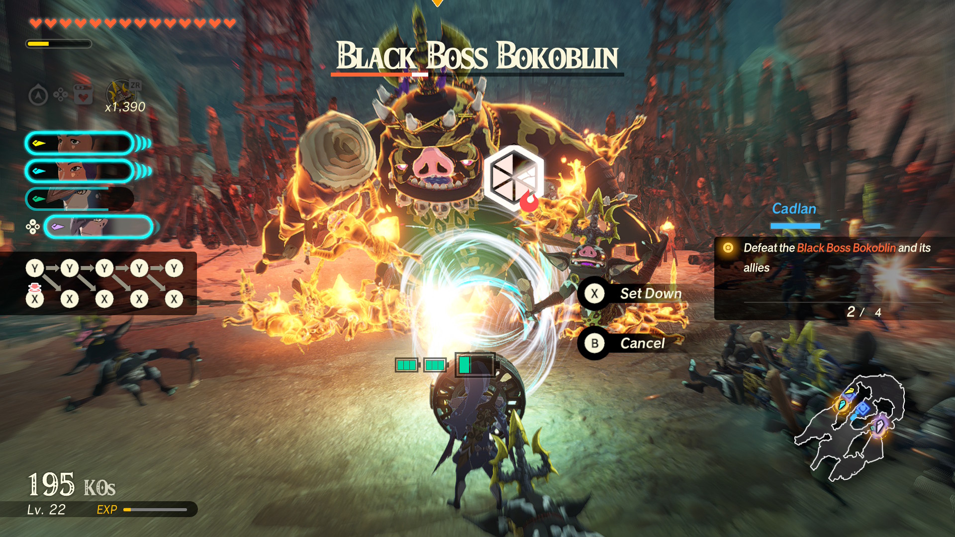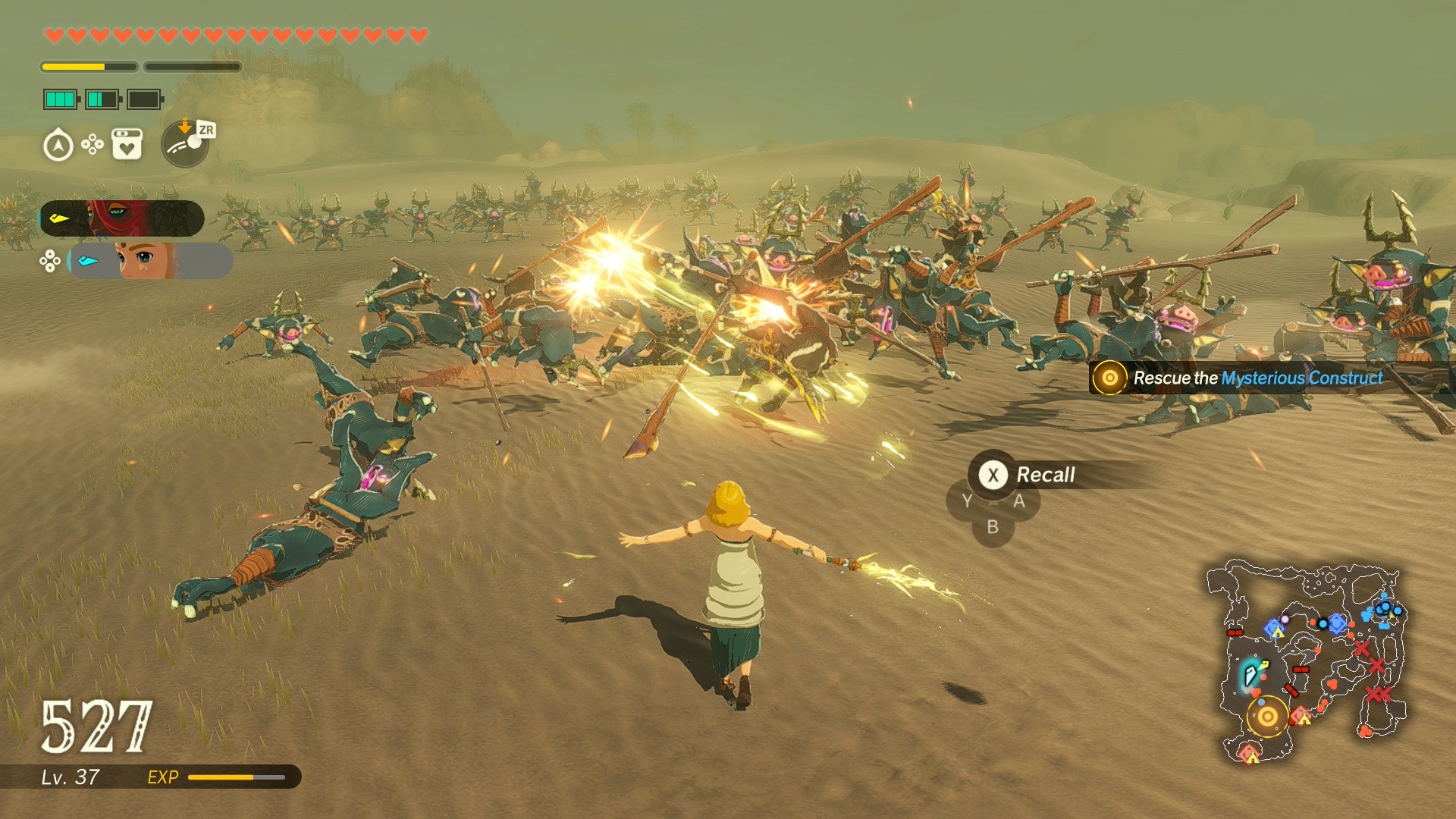 Pulmanratkontaa ei ole edelleenkään luvassa toiminnan tasapainoksi, mutta Tears of the Kingdomista tutut pattereilla toimivat Zonai-vempeleet monipuolistavat taistelua, ja niiden tuoma lisävahinko jouduttaakin mukavasti isompien hirviöiden kaatamista ja suojien murtamista. Virran loppuessa on odotettava pieni tovi tai käytettävä varaparistoja, joita voi kantaa vain rajoitetun määrän. Suurimmissa kahakoissa varastot saa täytettyä täydennyspisteellä.