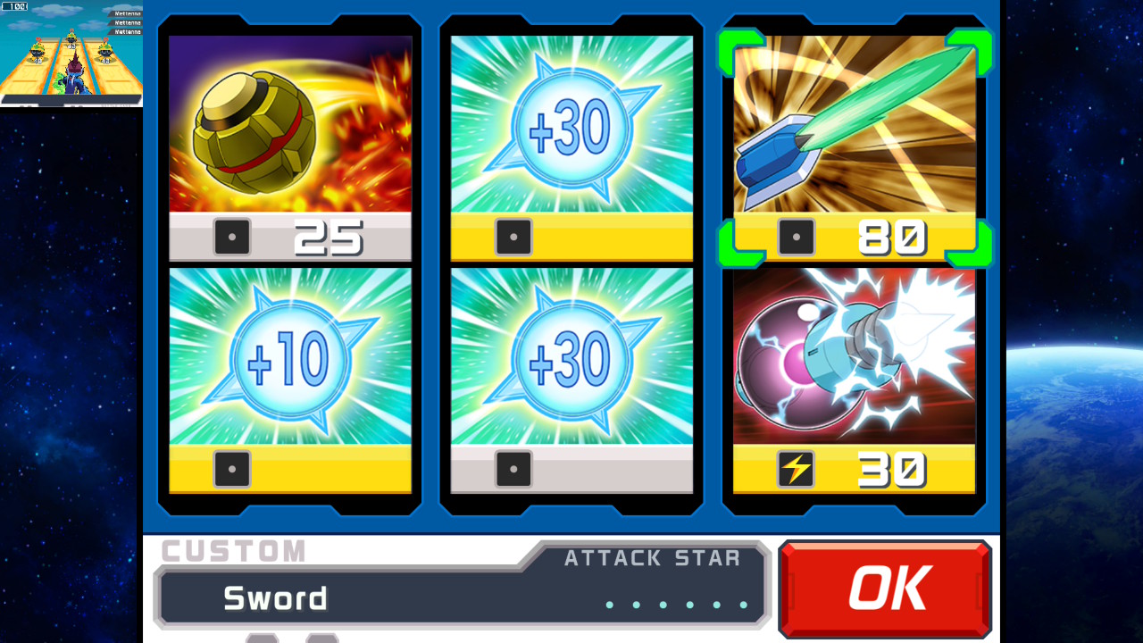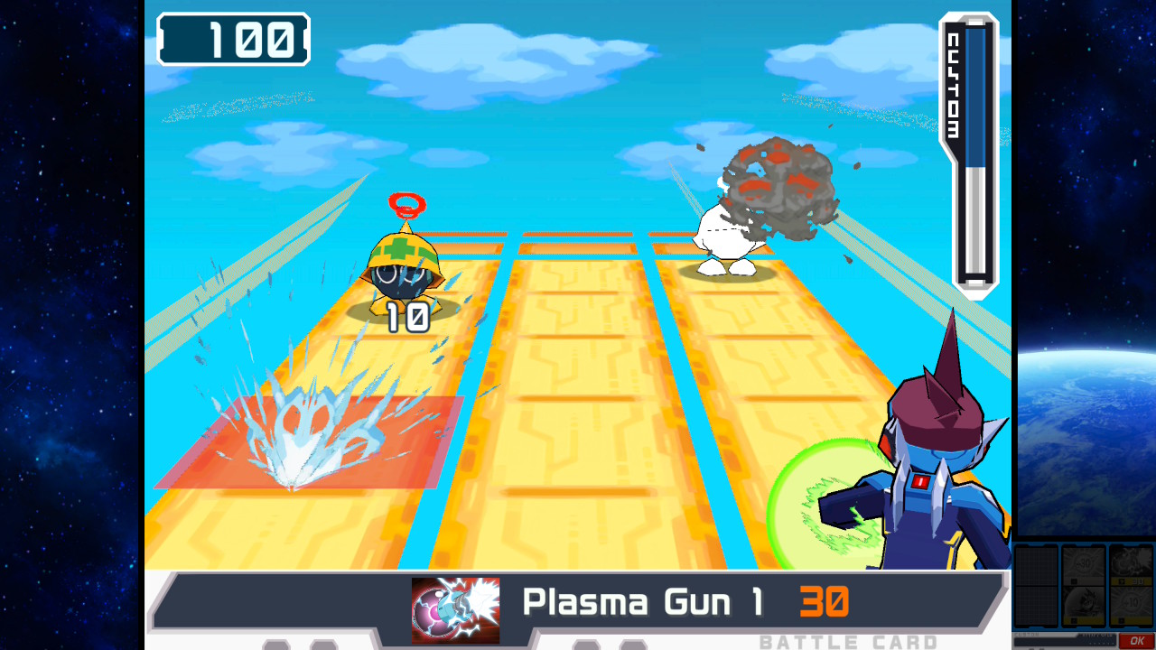 Hyökkääminen hoidetaan erilaisin ominaisuuksin varustelluilla korteilla. Kortteja valitaan aina maksimissaan kolme per hyökkäysvuoro. Kun koko käsi on käytetty, ammuskellaan megaukkojen perinteisellä hernepyssyllä yhtä osumapistettä kerrallaan pois, tai odotetaan vuoromittarin täyttymistä, jolloin käyttöön saa ottaa uudet kolme korttia. Korttivalikoima on monipuolinen: mukana on esimerkiksi useamman ruudun peittäviä kranaatteja, vahinkoa moninkertaistavia tehosteita sekä lasermiekkoja, jotka toimivat niin lähietäisyydellä kuin kauempanakin olevia vastustajia vastaan. Vihollisten hyökkäykset noudattavat samaa logiikkaa. Ylhäältä alas valuvat ja yhden ruudun kerrallaan valtaavat mäjäytykset väistää unissaankin, mutta tahti kiihtyy ja loppupuolella sarjatulta sataa koko kentän leveydeltä. Kovimmissa pomotaisteluissa käytettävien korttien kanssa saa hioa strategioita ihan kunnolla.