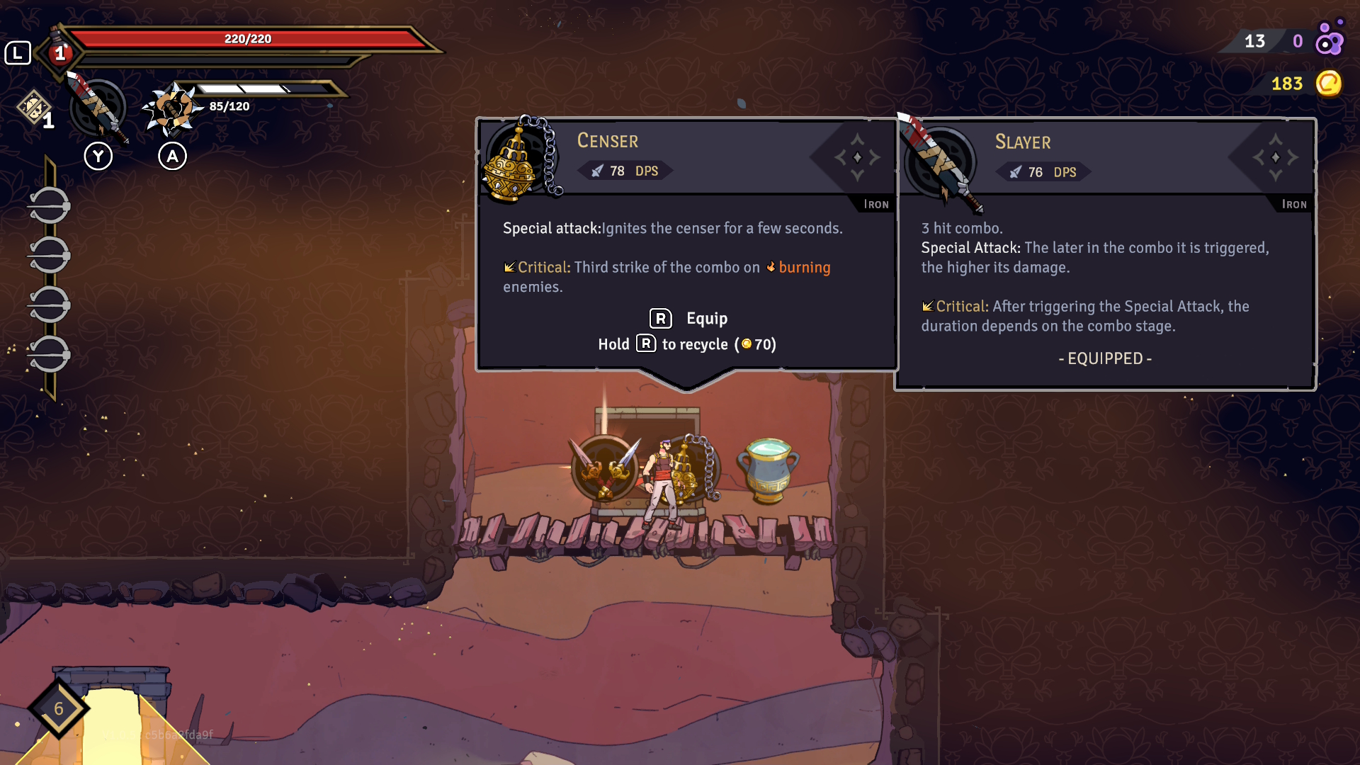 Portin takana odottaa myös palkinto, joka on salainen niin kauan kunnes investoi tukikohdassa myytävään ovensilmäpaljastimeen. Yleisimmät palkkiot ovat vaihdon välineitä: keitaalla ostellaan kiertoon uusia aseita kokemuspisteillä, muissa kaupoissa kelpaavat ainoastaan kultakolikot. Arvokkain aarre on vain yrityksen aikana voimassa oleva ylimääräinen medaljonkislotti, sillä kultaa ja kokemuspisteitä kertyy runsaasti muillakin tavoilla, mutta pelihahmon kykyihin vaikuttavia medaljonkeja mahtuu oletuksena inventaarioon vain kolme kappaletta. Koska taskutila on rajallista, eikä yhtäkään esinettä valita pysyvästi arsenaaliin ennen yrityksen alkua, on erilaisten ”buildien” suunnitteleminen ennakkoon vaikeampaa kuin monissa muissa rogueliteissä. Peli on viihdyttävimmillään juuri silloin, kun voimakkaimpia talismaaneja ei tarvitse jättää homehtumaan aarrearkkuihin, mutta puolivälin saavuttaminen hikisesti pelkästään kolmen tai neljän lisäkyvyn voimin ei ole kovin harvinainen näky.
