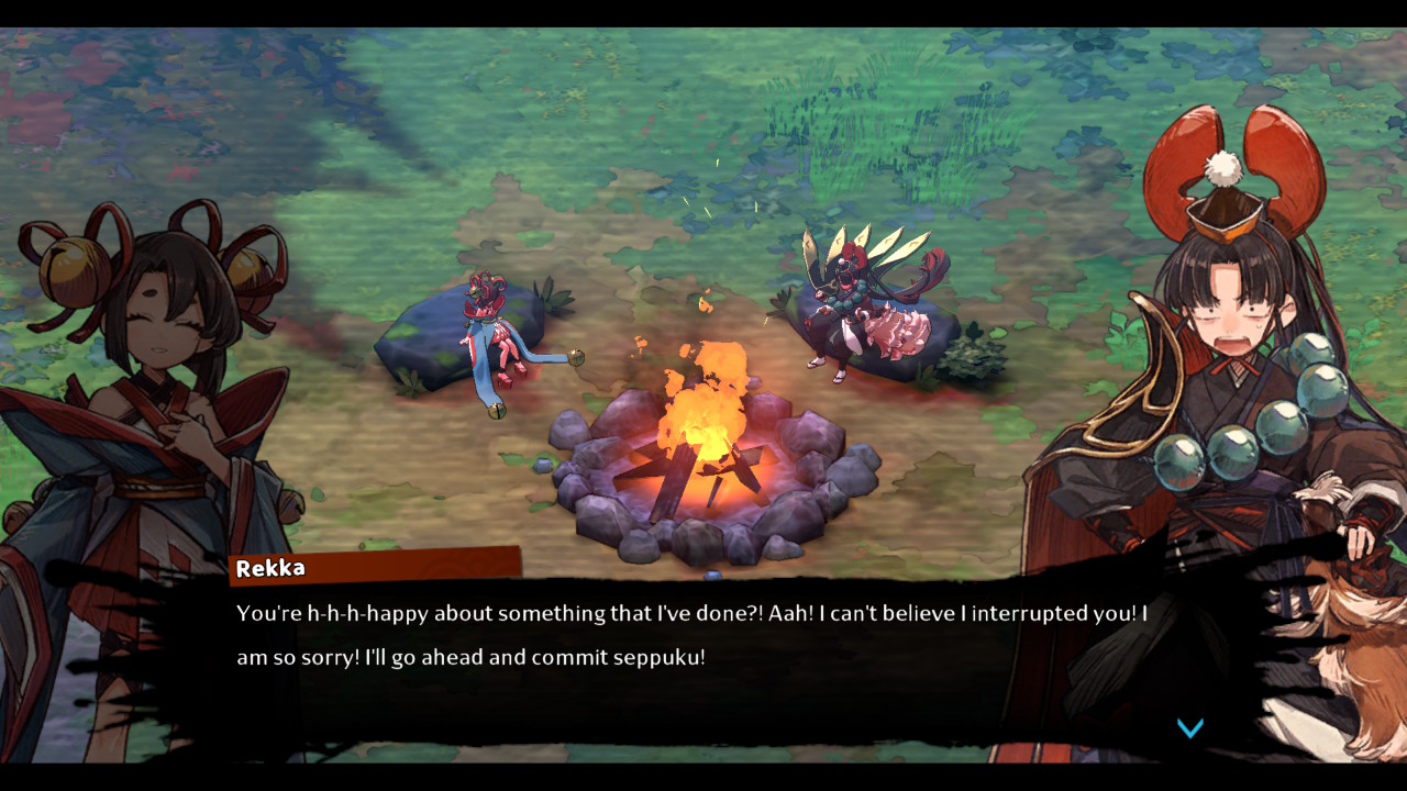 Toinen yllätys on se, kuinka paljon kahdeksikon jäsenillä riittää keskusteltavaa pomotaistelujen jälkeisen nuotion äärellä. Jokaisella hahmolla on omat kahdenväliset juttunsa muiden kanssa, ja oletin aluksi, että tulen äärellä istuttaisiin loppuilta mykkänä muutaman sanan vaihtamisen jälkeen. Sen sijaan dialogia riittää yllättävän pitkäksi ajaksi, ja keskustelujen seuraamisesta tulee nopeasti jopa pelaamista kiinnostavampaa puuhaa.